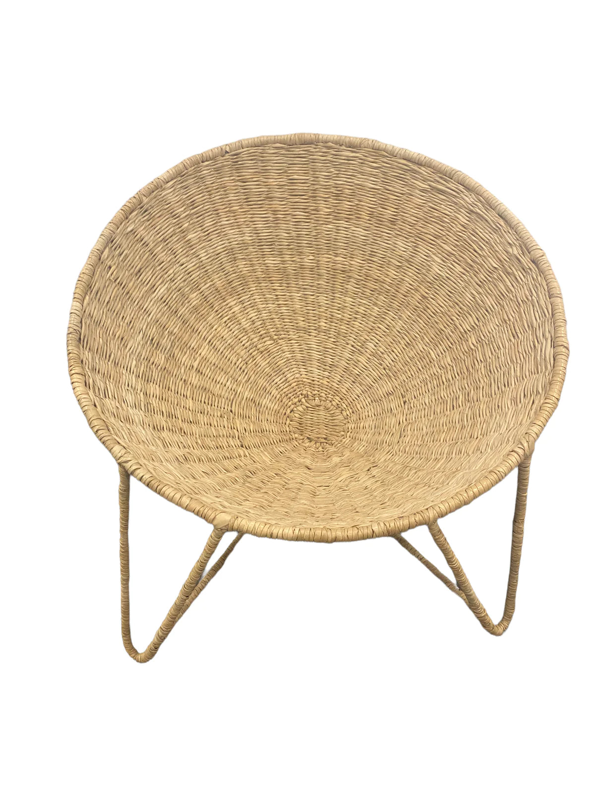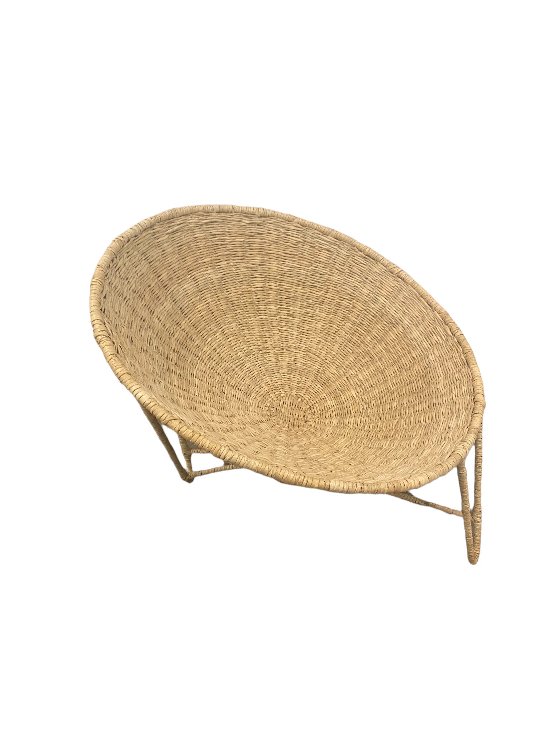 The metal rods give the chair stability and a unique shape, while the hand-woven weave made from dried palm leaves exudes a natural beauty and elegance. Perfect for a sheltered outdoor or indoor space, this chair will add a touch of exotic beauty to any room.