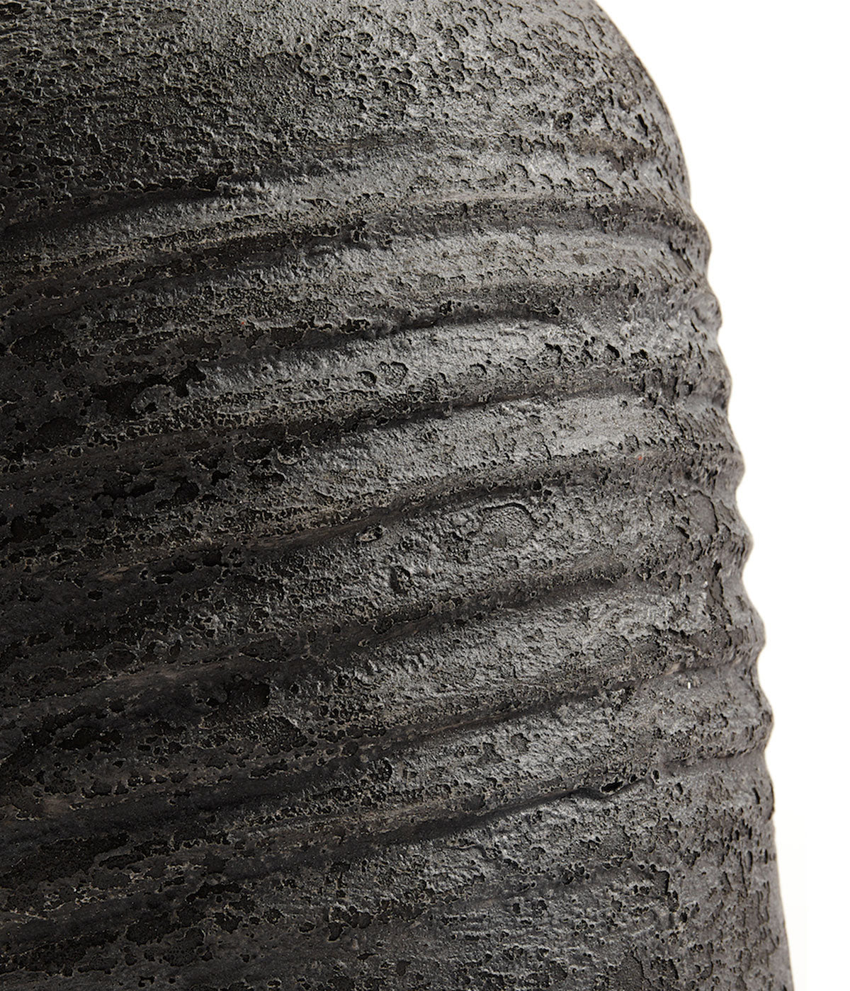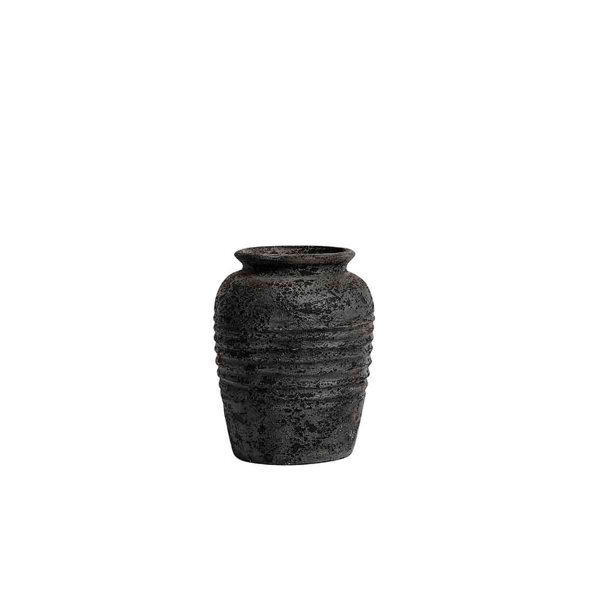 Zuerst erhält das Gefäß eine schwarze Grundierung, die dann abgeschliffen wird. Danach erhält das Terrakottagefäß eine dünne graue Farbschicht, die ebenfalls abgeschliffen wird, und dann wird das Gefäß beschichtet. Durch diesen Prozess entstehen Tiefe und Nuancen in der Farbe. Das Gefäß ist ideal für getrocknete Dekorationen oder Blumen.